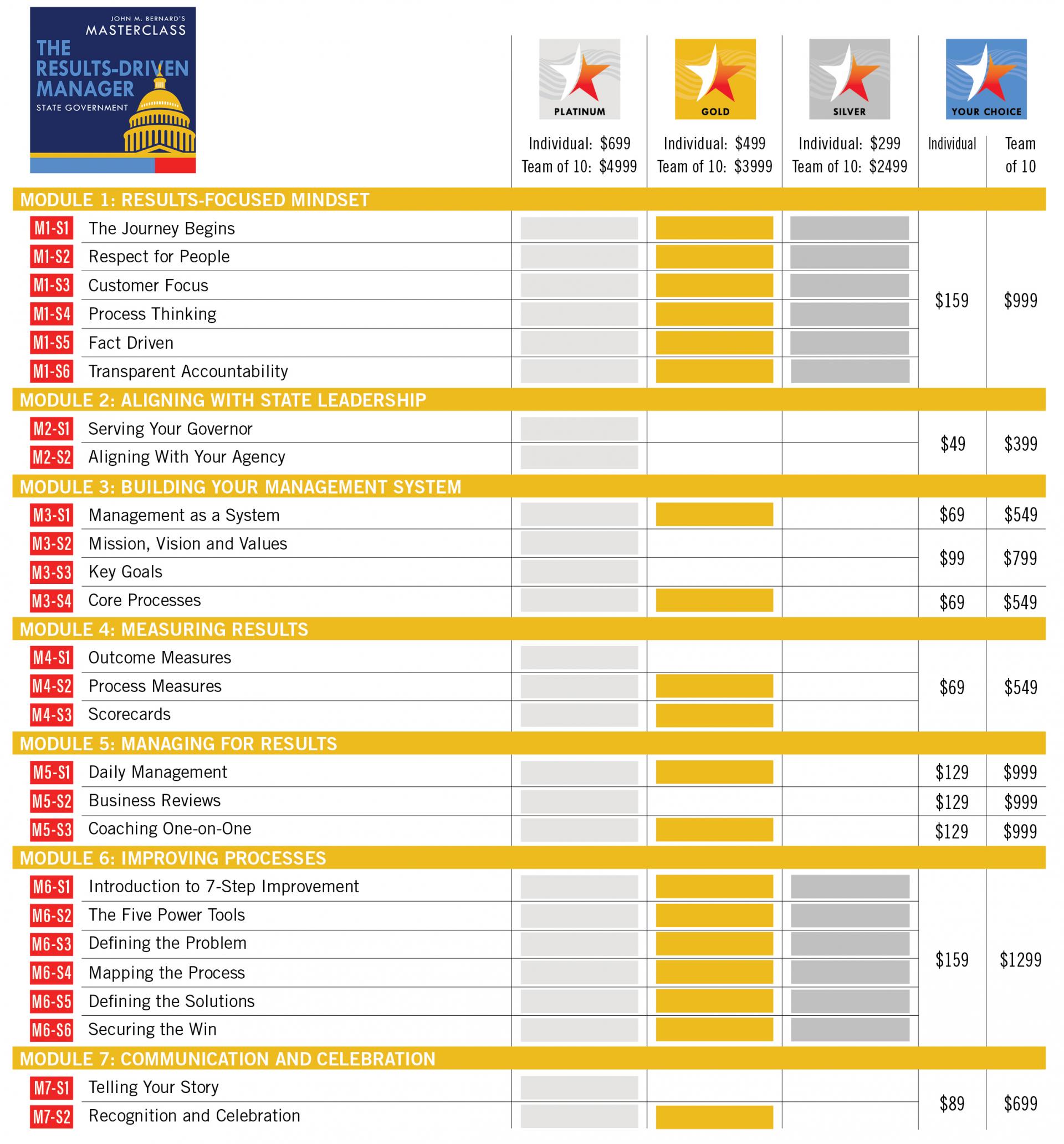 Here’s the harsh reality, on average 60 percent of the work in the typical government process is non-value added. If you can fix one process you will save enough time to take your MasterClass series. The MasterClass is designed to deliver content to you efficiently. Courses run on average about 20 minutes and have downloadable audio for convenience as well as tools and templates. Dig in, do the work, you’ll quickly find the time and much more.